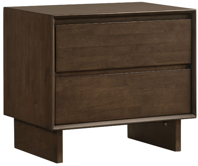 Add easy storage at your bedside with a modern two-drawer nightstand. Delivering streamlined style and a fresh, clean presentation, the nightstand boasts a warm brown wood grain finish. Its drawers are roomy and useful, complete with felt lining in the top, adding protection for everything from accessories to electronics.Read More