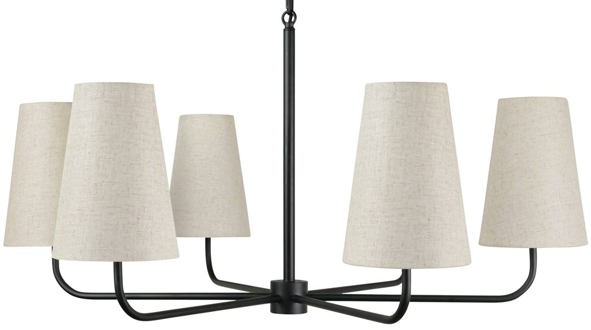 The Mathis chandelier's sleek metal frame and delicate chain detailing create an illusion of weightlessness, while six tapered linen shades diffuse a warm, inviting glow. This chandelier marries simplicity with sophistication, complementing various interior styles, from contemporary to transitional.Read More