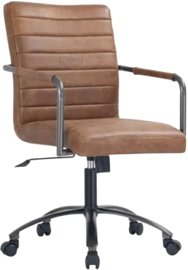The Roy office chair's channel-seamed upholstery, tailored in top-grain leather, offers comfort and support for extended work sessions. Its leather-wrapped armrests infuse warmth into the iron frame. The chair's ergonomic design promotes better posture, adapting seamlessly to a variety of interior settings without the traditional office feel.Read More
